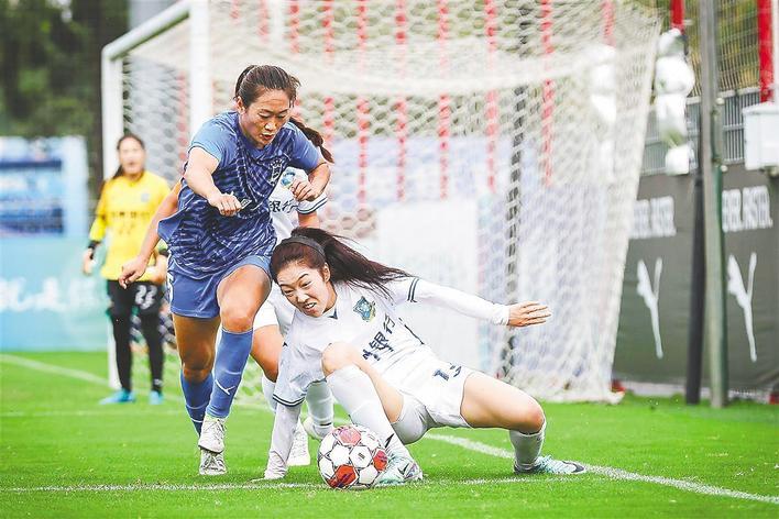 女足球运动员吴海扬(左)与比赛进行了艰苦的战斗。 (照片由Hubei Daily All Media Reporter拍摄)湖北每日全媒体记者Hu Yuwei...