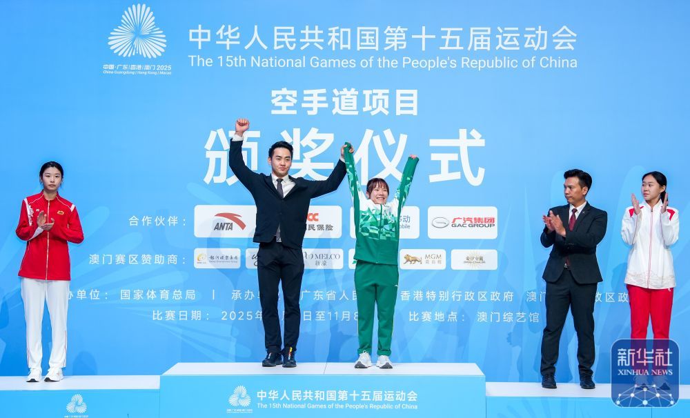 11月8日,第十五届全运会群众比赛空手道女子55公斤级个人决赛在澳门举行。澳门队选手方文慧击败河南队选手李瑞平,夺得金牌。 ^ 澳门选手方文辉(中右)在领奖台上。 ^ 澳门队庆祝胜利。 ^ 澳门队球员方文辉(中)与河南队球员李瑞平在比赛中。 ↑ 澳门队球员方文辉(左)与河南队球员李瑞平在比赛中。 ↑ 澳门队球员方文辉(右)与河南队球员李瑞平在比赛中。新华社