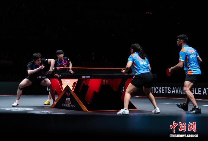 Ang larawan ay nagpapakita ng Wang Chuqin/Sun Yingha (kaliwa) na hinagupit ang bola sa tugma laban sa Indian na kumbinasyon ng Manash Shah/Chitale。中新网记者 侯宇 摄