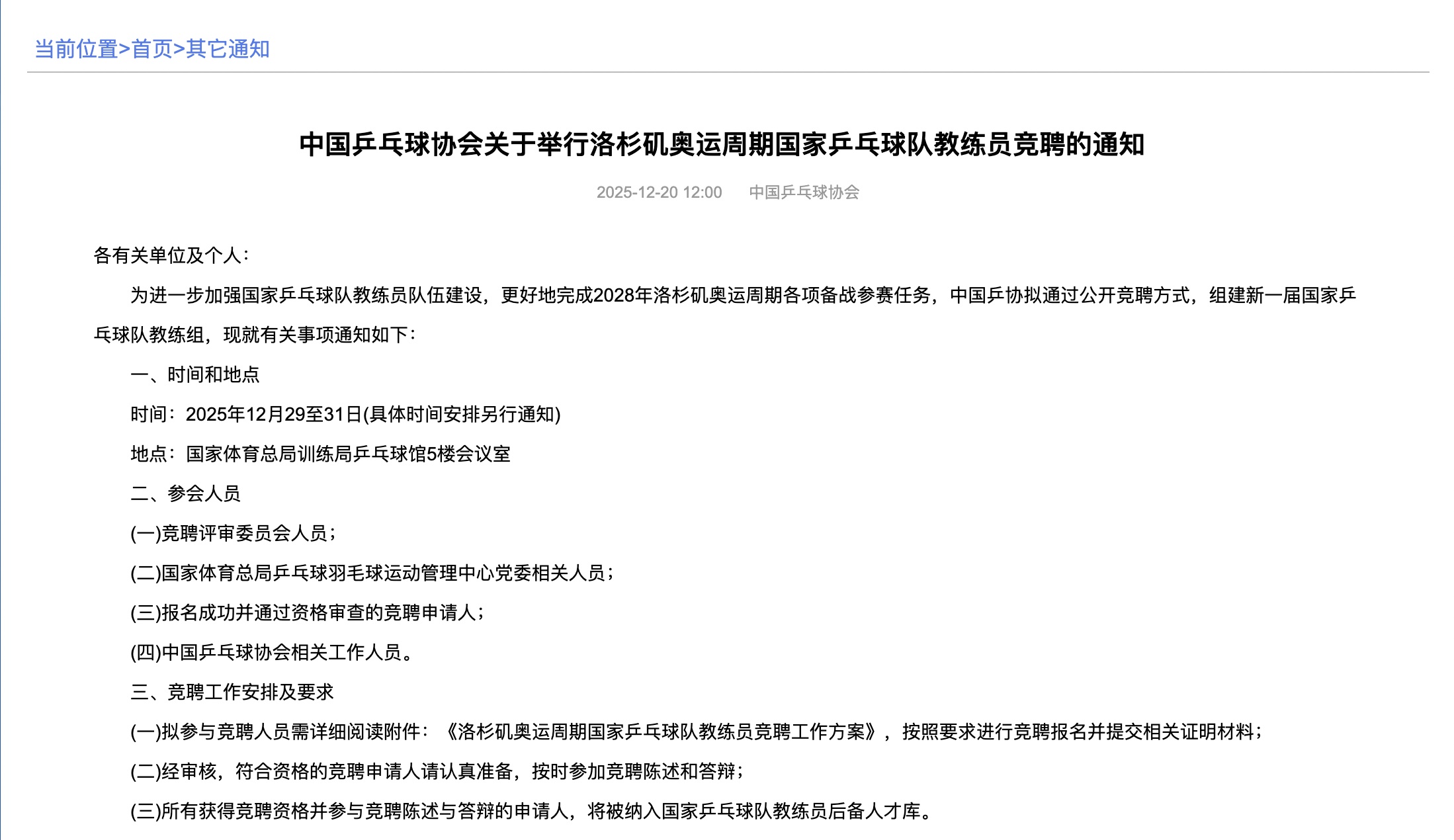 12月20日,中国乒协在其官网发布《中国乒协关于举办洛杉矶奥运会周期国家乒乓球队教练员竞争的通知》,正式启动新周期国家队教练员公开竞争。本次比赛将于2025年12月29日至31日在国家体育总局训练局乒乓球馆举行。在定位方面,将贴近洛杉矶奥运会实际需要和球队长远建设,进行科学规划。除主教练职位外,增设副主教练职位,对各教练职位的职责和胜任标准提出了更明确、更高的要求,强调先进的训练理念、优秀的临场指挥能力、技术创新意识和能力。青年后备力量综合素质培养。据悉,中国乒协已成立专门工作组,研究制定《洛杉矶奥运会周期全国乒乓球队教练员竞赛工作方案》,将严格按照程序实施,并报上级组织批准。比赛将通过公开报名、资格审查、比赛陈述与答辩、审查委员会无记名投票、公布最终结果等方式进行,产生国家队男女队主教练1名、副主教练1名、男女队主教练各1名、男女国青队主教练各1名、国家队教练12名、国家队教练10名。评审委员会由中国乒协有关负责人、乒乓球专家、乒乓球科学界代表组成。研究人员、优秀运动员代表。国家体育总局乒羽管理中心党委派员对本次比赛进行监督,确保比赛的严肃性、合规性、权威性。中国乒协表示,希望通过本次公开赛,进一步优化国乒教练组结构,选拔出一支能够带领国家队再次夺得奥运辉煌的优秀教练团队。也将为国家乒乓球教练人才提供一个高标准的展示和交流平台,共同夯实中国乒乓球的人才基础。